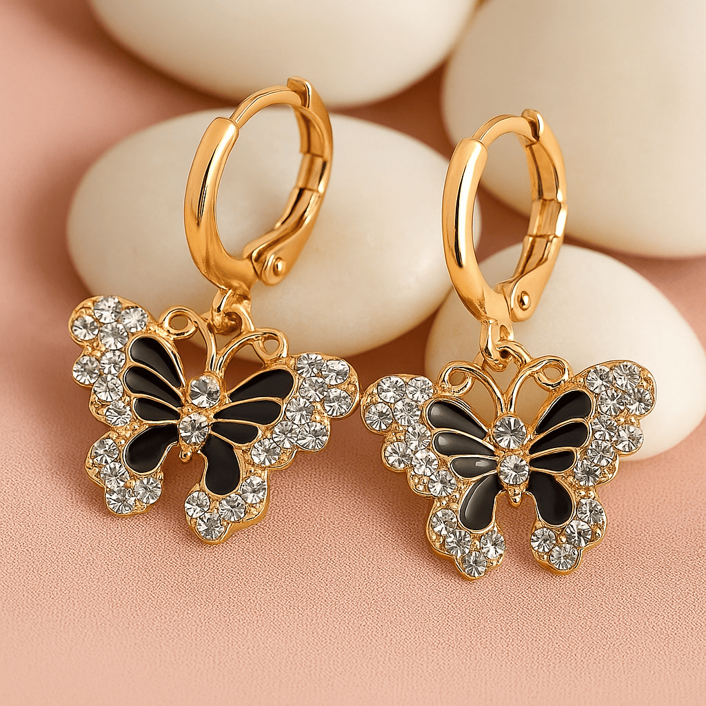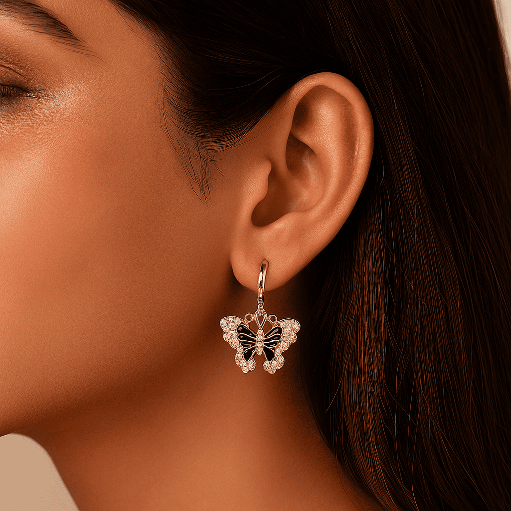 Let your style take flight with Avniri’s Butterfly Earrings for Women and Girls – a fresh take on feminine fashion. These beautiful earrings feature a charming butterfly motif, designed with shimmering crystal stones and bold black enamel accents that make the details truly pop. The metallic base has a sleek finish (non-gold plated), giving you the glam without the price tag.