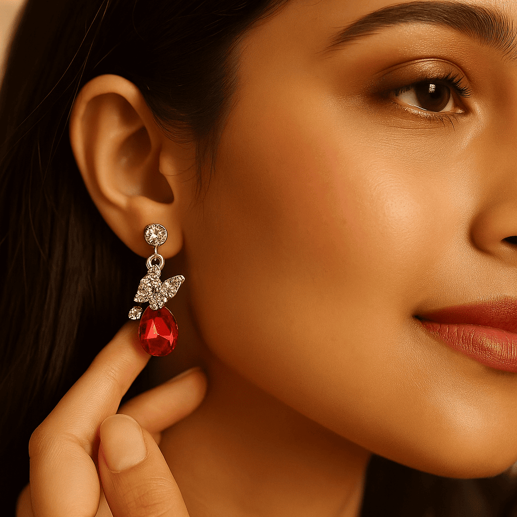 The bright red teardrop paired with a delicate butterfly design brings out your inner glow.