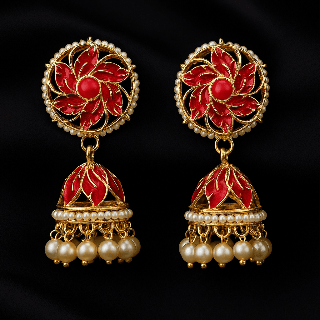 Step into elegance with Avniri’s Royal Red Floral Jhumka Earrings for Women & Girls. The bold red enamel with floral detailing, shining pearl border, and dangling pearl drops make this pair a perfect mix of tradition and modern charm.